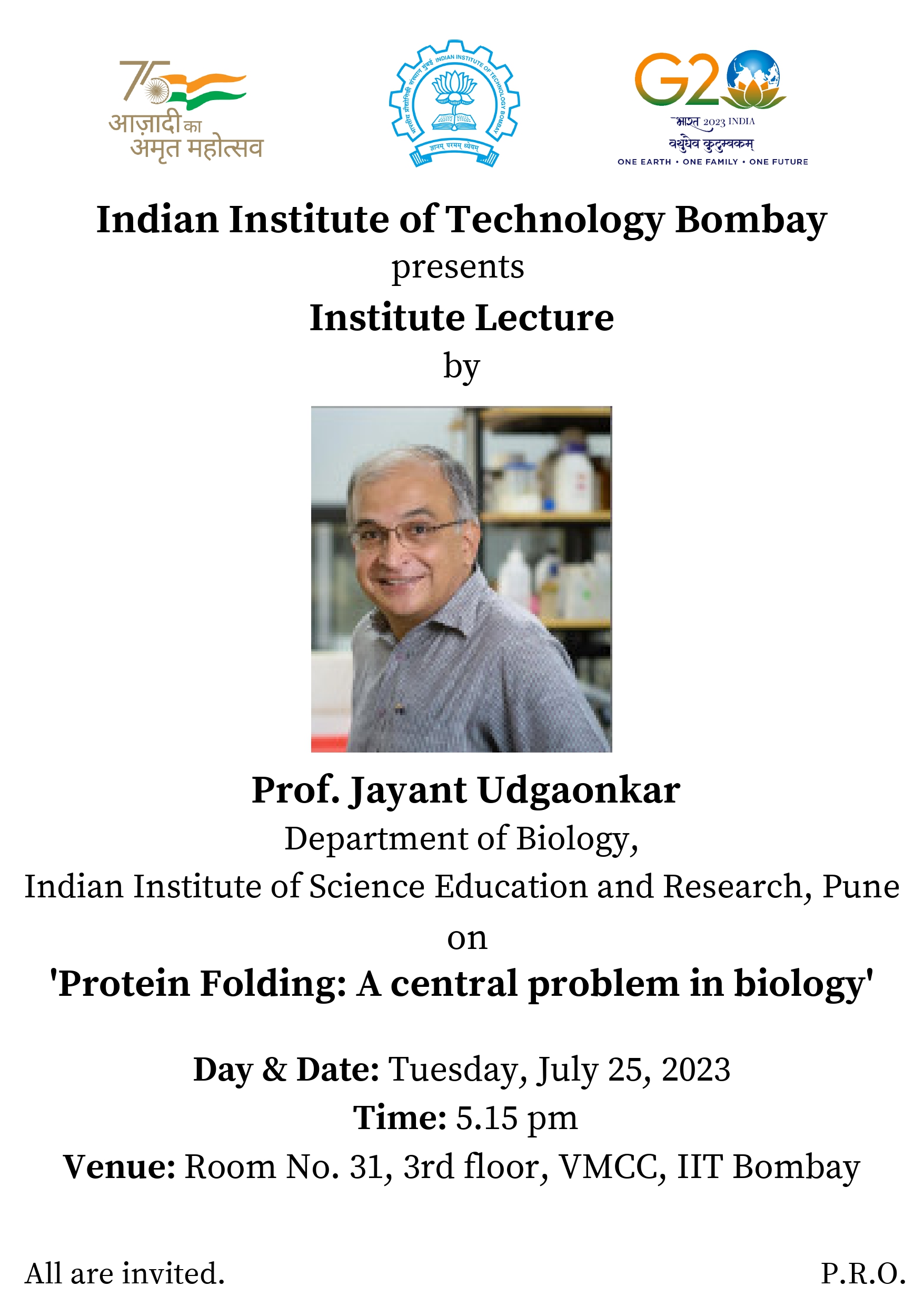 About the speaker: Prof. Jayant B. Udgaonkar is a well-known Indian biochemist, molecular biologist, academic and a senior professor at the National Centre for Biological Sciences. He is Ex-director and faculty member of IISER Pune. Prof. JBU is a J. C. Bose National Fellow; he is known for his studies on protein folding. He is an elected fellow of the Indian Academy of Sciences, Indian National Science Academy and The World Academy of Sciences. The Council of Scientific and Industrial Research, the apex agency of the Government of India for scientific research, awarded him the Shanti Swarup Bhatnagar Prize for Science and Technology, one of the highest Indian science awards, in 2000, for his contributions to biological sciences. He is also recipient of G.N. Ramachandran Gold Medal for Biological sciences.