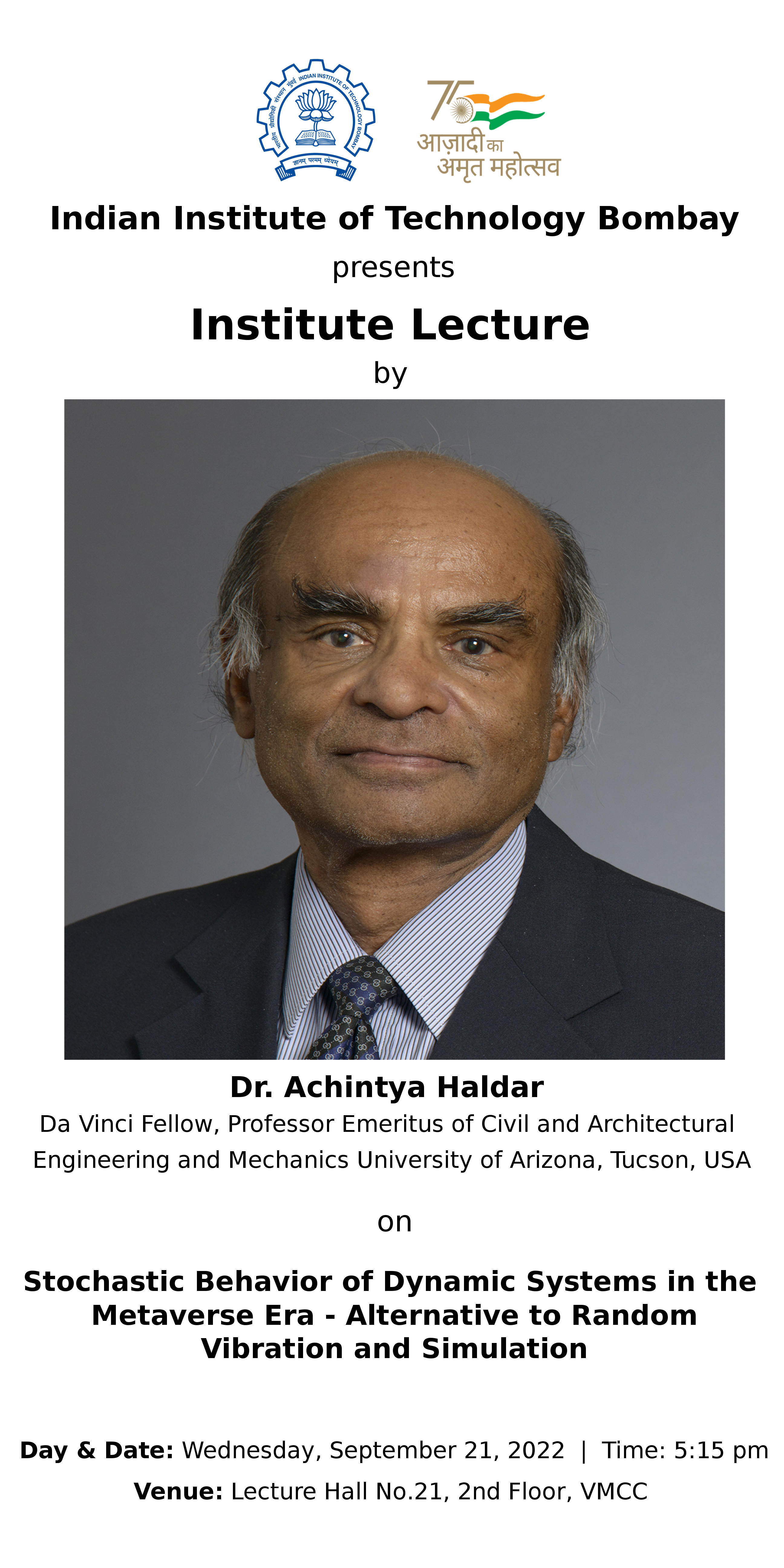 Speaker: Dr. Achintya Haldar, Da Vinci Fellow, Professor Emeritus of Civil and Architectural Engineering and Mechanics University of Arizona, Tucson, AZ, USA.